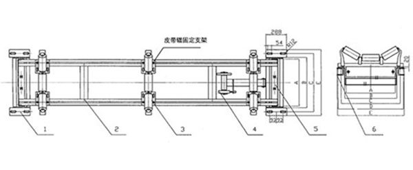 1:承重架 2:稱(chēng)重橋 3:托輥架及托輥 4:測(cè)速機(jī)構(gòu)及測(cè)速傳感器 5:荷重傳感器 6:皮帶輸送機(jī)并配有MT2002大皮帶計(jì)量電腦積算儀表 | |